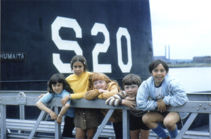 Denise e Danilo Dagnino levam coleguinhas da escola primária em Barrow-in-Furness para visitarem o Submarino Humaitá (classe Oberon) atracado no cais do estaleiro Vickers