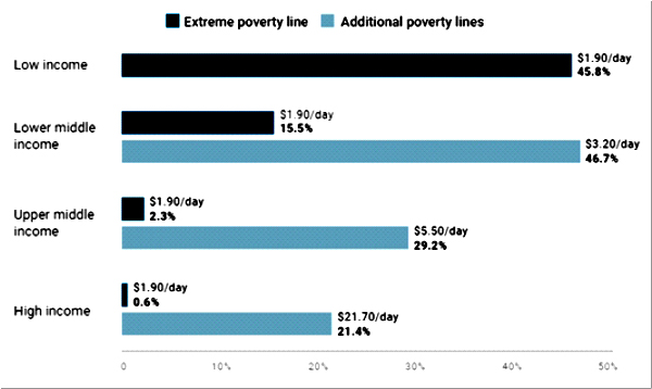 A linha de pobreza extrema (extreme poverty line) de valor correspondente a 1,90 dólares por pessoa por dia é considerada para todos os grupos. Porém, outros valores foram adicionados para definir novas linhas de pobreza (additional poverty lines), conforme mostra a Fig. 2.1. Nela, vemos o valor de 3,20 dólares por dia para a linha de pobreza do grupo de renda média baixa, 5,50 dólares por dia para o grupo de renda média alta e 21,70 dólares por dia para o grupo de alta renda, todas elas gerando sua respectiva proporção de pobres em percentagem (%).