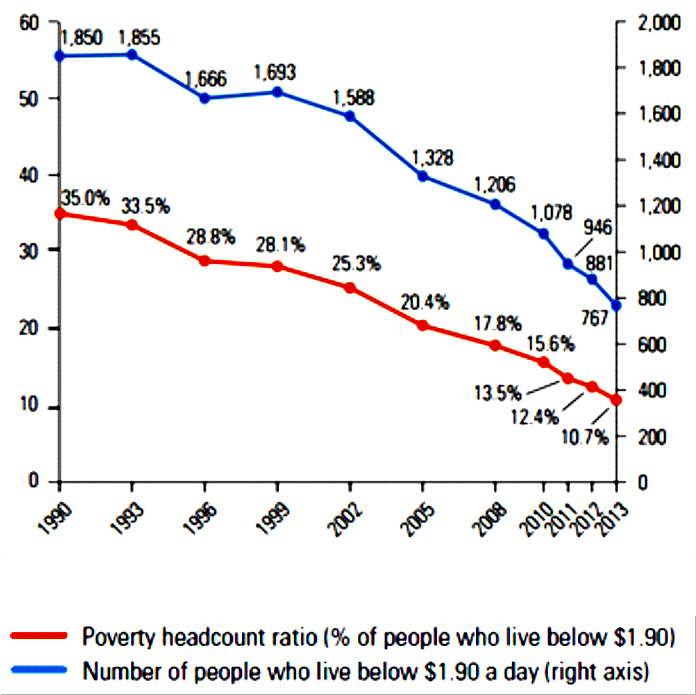O relatório sobre pobreza e prosperidade compartilhada do World Bank Group (2016) mostra, conforme Fig. 2.2, a evolução da pobreza extrema no mundo durante o período 1990 a 2013. Podemos notar um significativo progresso no sentido de reduzi-la. Em 2013, o planeta, com 7,176 bilhões habitantes, apresentou cerca de 767 milhões de pessoas vivendo, cada uma, com 1,90 dólares ou menos por dia, isto é, 10,7% da população total. Apesar da significativa redução mostrada na figura, um percentual de 10,7% ainda é muito alto, sem dizer que as pessoas, logo acima deste limite, continuam sofrendo enormes dificuldades para sobreviver, enfrentado fome, doenças, violência, e outras dificuldades sérias.