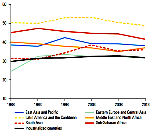 Com relação à desigualdade de renda, podemos nos referir à Fig. 2.3 extraída do citado relatório do World Bank Group (2016). Nela, vemos o índice de Gini para sete regiões, obtido pela média aritmética de alguns de seus respectivos países, no período de 1988 a 2013. A região da América Latina & Caribenha (Latin America and Caribbean) apresenta os maiores níveis de desigualdade, apesar de mostrar uma razoável redução a partir de 2003, após um período de aumento, anteriormente. A região da África Subsaariana (Sub-Saharan Africa) vem em segundo lugar. Analisar a desigualdade de renda por região é um desafio, pois cada país tem razões diferentes para suas respectivas distribuições de renda. Além disso, conforme citamos acima, o índice de Gini não obedece ao princípio da decomposição, o que pode nos levar a uma incoerência entre o coeficiente do país e o da região. A sugestão é concentrar o estudo nos índices específicos dos países. Em 2013, por exemplo, temos, entre outros, os seguintes valores de Gini:  Haiti em torno de 60%, Brasil pouco acima de 50%, Peru em torno de 45%, China e Argentina cerca de 43%, Estados Unidos próximo de 42%, Índia perto de 38%, Reino Unido perto de 32% e Noruega em torno de 25%.