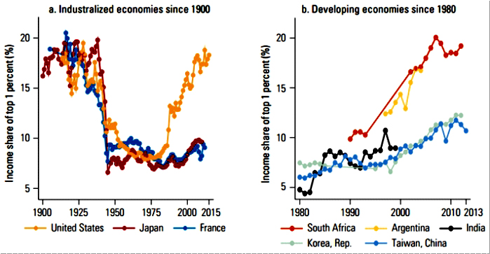 Stiglitz (2016) ao analisar o aumento da desigualdade de renda nos Estados Unidos associa a causa da pobreza neste país aos 1% da população norte-americana que pertence ao topo da distribuição de renda. O autor cunhou o termo em inglês rent seeking, cuja tradução direta em português seria caça a renda. Porém, esta tradução não é boa pois o significado da palavra rent é outro, como vimos no primeiro item. Rent seeking segundo ele, “define muitas formas pelas quais o processo político americano atual ajuda os ricos às custas dos demais, como transferências e subsídios governamentais, leis que tornam o mercado de trabalho menos competitivo, leis que permitem que os CEOs fiquem com uma fatia desproporcional da receita corporativa, … leis que permitem às corporações obter lucros degradando o ambiente” (p. 83). CEO é a abreviatura, em inglês, do primeiro cargo da corporação. Ao examinar a legislação tributária dos Estados Unidos envolvendo casas de veraneio, pistas de corrida, cervejaria, fundos de hedge, etc. Stiglitz (2016) diz que “a maioria das brechas e “brindes” das leis fiscais não surgem do nada, evidentemente. De modo geral, foram criadas em troca de contribuições de campanha (ou pelo menos, em resposta a elas) oferecidas por doadores influentes” (p.178). Ele estima que esse tipo de provisões especiais é da ordem de 123 bilhões de dólares por ano, assim como o valor das brechas fiscais relacionadas. A Fig. 3.1a publicada por World Bank Group (2016) mostra a porção da renda para 1% do topo da população (income share of top 1 percent) para alguns países industrializados desde 1900 (industralized economies since 1900) onde vemos o forte aumento da renda deste grupo nos Estados Unidos a partir dos anos 70, enquanto a França e o Japão mantiveram a renda do topo sob controle e num patamar bem mais abaixo. A Fig. 3.1b apresenta estas informações para alguns países em desenvolvimento a partir de 1980 (developing economies since 1980) onde Argentina e África do Sul tem tendências parecidas com as observadas para os Estados Unidos.