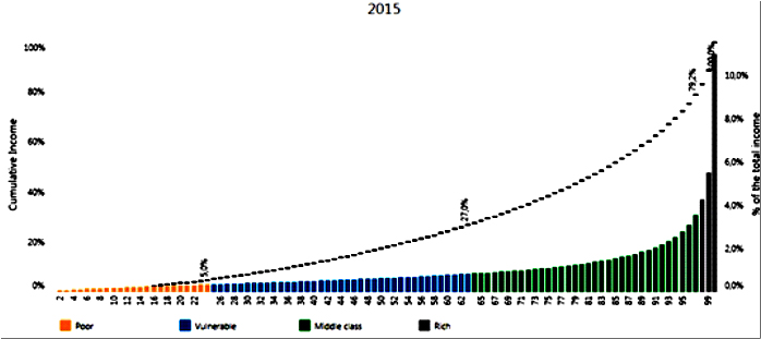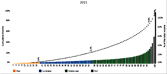 Por exemplo, The World Bank (2017), mostra uma divisão de classes sociais diferente para a região da América Latina & Caribenha (LAC, em inglês). A Fig. 3.2 e a Fig. 3.3 apresentam as distribuições de renda em 2015 da LAC e do Brasil, respectivamente. Ele sugere a sociedade com quatro classes sociais composta por pobre (poor), vulnerável (vulnerable), média (midle class) e rica (rich).