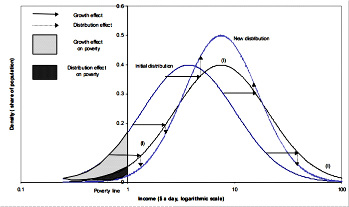 Bourguignon (2004) afirma que a redução da pobreza, num dado país e num dado momento, é completamente determinada pela taxa de crescimento da média da renda da população e pela mudança da distribuição de renda para diminuir a desigualdade. Ele afirma que o real desafio para desenvolver uma estratégia para reduzir a pobreza repousa na interação entre distribuição de renda e crescimento e não na relação entre pobreza e crescimento de um lado e pobreza e desigualdade do outro. Assim, a grande dúvida que persiste no sentido de montar uma estratégia para redução de pobreza é se crescimento e distribuição são independentes ou fortemente relacionados.