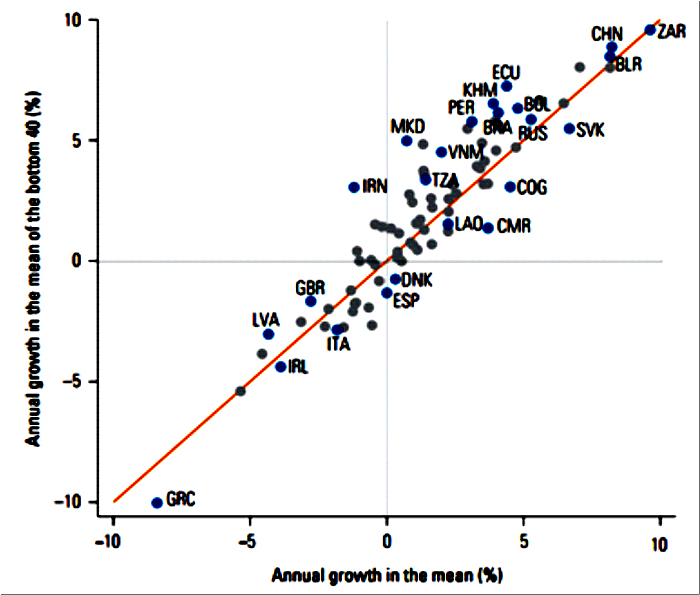A Fig. 4.2 mostras a relação entre a crescimento anual da média (annual growth in the mean) da distribuição de renda de diversos países contra o crescimento anual da média de 40% da base (annual growth in the mean of the botton 40) para o período 2008 a 2013. Através dela, o World Bank Group (2016) mostra que países com alto crescimento da média apresentam também maior crescimento da média de 40% da base. Por outro lado, países com taxas de crescimento negativas também mostram declínio na renda dos 40% da base. Além disso, vemos que, a medida que os países crescem mais depressa, há também uma expectativa do crescimento dos 40% da base, na mesma proporção. Notamos que os países cujo crescimento da média da renda dos 40% da base é maior que o crescimento da média, isto é, países com média acima da reta bissetor da figura, apresenta prosperidade compartilhada prêmio. Portanto, crescimento da economia, impulso da prosperidade compartilhada e redução da pobreza são três objetivos absolutamente compatíveis, conforme o modelo do triângulo, descrito acima.