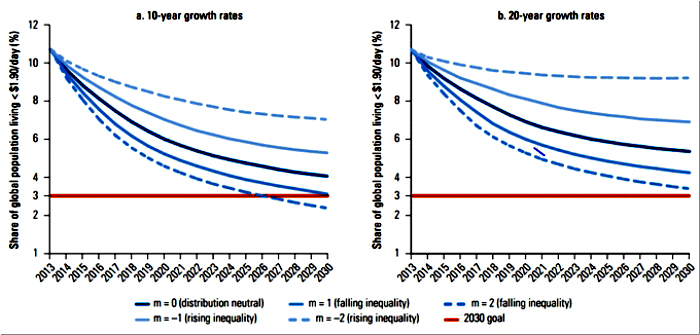 O World Bank Group (2016) está preocupado com o decréscimo nas previsões do crescimento econômico para várias regiões do mundo durante os próximos anos. Daí, vem a questão se o objetivo de acabar com a pobreza extrema em 2030 ainda seria possível. Para tanto, várias simulações foram feitas assumindo diversos níveis de crescimento e alterações da distribuição avaliada pela prosperidade compartilhada prêmio. Os resultados deste estudo podem ser vistos na Fig. 4.3. A fatia da população global (share of global population) onde cada pessoa vive com menos de 1,90 dólares por dia foi colocada no eixo vertical da figura. A meta para 2030 foi fixada para que esta fatia não seja maior que 3%. A prosperidade compartilhada prêmio é medida pelo parâmetro m. O painel a da figura considera o crescimento dos últimos 10 anos antes 2013 inclusive e, o painel b o crescimento dos últimos 20 anos antes de 2013 inclusive, que, neste caso, é menor que o anterior.