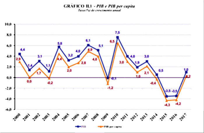 Vamos, então, a título de exemplo, analisar o caso do Brasil. O crescimento econômico brasileiro vem sofrendo acentuada queda desde 2010, com leve recuperação em 2017, conforme mostra a Fig. 4.4 sobre a evolução do Produto Interno Bruto (PIB) publicada pelo IBGE (2017) (2).