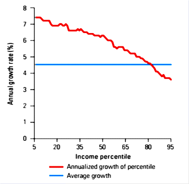 Ao analisar a distribuição de renda no período, o World Bank Group (2016) utilizou a curva de incidência do crescimento da renda, conforme Fig. 4.6. Esta curva é uma ferramenta muito útil pois, indica a taxa de crescimento da renda, em dado período, para cada porção estudada da distribuição. A taxa de crescimento anualizada da renda é plotada no eixo vertical e, os quantis, em percentagem, no eixo horizontal. A reta horizontal fixada em 4,5% indica o crescimento anualizado da média da distribuição do período estudado.
