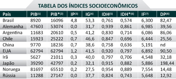 Notas: (1) Produto Interno Bruto per capita (em Dólar Americano); Ano: 2018 para todos, exceto Irã 2017); Fonte: Banco Mundial (25.01.20) (2) Produto Interno Bruto per capita com Paridade do Poder de Compra (em Dólar Americano); Ano: 2018 para todos exceto Irã 2017; Fonte: Banco Mundial (25.01.20) (3) Índice de Pobreza (em % abaixo da linha de pobreza fixada em 1,90 Dólar Americano por dia); Ano: 2015 para Alemanha, China, Noruega, Rússia; 2016 para EUA; 2017 para Brasil, Argentina, Chile); Fonte: Banco Mundial (25.01.20) (4) Índice de Gini; Ano: 2015 para Alemanha, China, Noruega, Rússia; 2016 para EUA; 2017 para Brasil, Argentina, Chile; Fonte: Banco Mundial (25.01.20) (5) Índice de Desenvolvimento Humano; Ano: 2018 (Fonte: Nações Unidas) (6) Índice de Desenvolvimento Humano Ajustado pela Desigualdade; Ano: 2018 (Fonte: IDR 2019,UN) (7) Índice de Felicidade (Escada de Cantril); Período: 2016-2018 (Fonte: WHR 2019) (8) Dívida Pública (em % do PIB); Ano: 2018; Fonte: Fundo Monetário Internacional