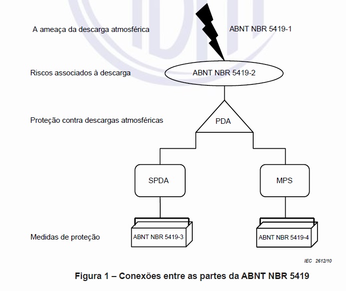Por razões práticas, os critérios para projeto, instalação e manutenção das medidas de proteção são considerados em dois grupos separados: o primeiro grupo se refere às medidas de proteção para reduzir danos físicos e riscos à vida dentro de uma estrutura e está contido na NBR 5419-3; e o segundo grupo se refere às medidas de proteção para reduzir falhas de sistemas elétricos e eletrônicos em uma estrutura e está contido no ABNT NBR 5419-4. As conexões entre as partes da ABNT NBR 5419 são ilustradas na Figura 1.