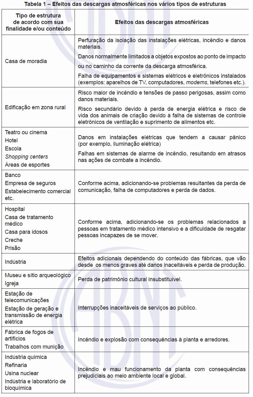 A extensão dos danos e falhas na vizinhança depende das características das estruturas e das características da descarga atmosférica.As principais características das estruturas relevantes para os efeitos das descargas atmosféricas incluem: construção (por exemplo, madeira, alvenaria, concreto, concreto armado, estrutura em aço); função (residência, escritório, comércio, rural, teatro, hotel, escola, hospital, museu, igreja, prisão, shopping center, banco, fábrica, área industrial, área de práticas esportivas); ocupantes e conteúdos (pessoas e animais, presença ou não de materiais combustíveis ou explosivos, sistemas elétricos e eletrônicos de baixa tensão ou alta tensão); linhas elétricas e tubulações metálicas que adentram a estrutura (linhas de energia, linhas de sinal, tubulações); medidas de proteção existentes ou providas (por exemplo, medidas de proteção para reduzir danos físicos e risco à vida, medidas de proteção para reduzir falhas em sistemas internos); dimensão do risco (estrutura com dificuldade de evacuação ou estrutura na qual pode haver pânico, estrutura perigosa às redondezas, estrutura perigosa ao ambiente). A Tabela 1 apresenta os efeitos das descargas atmosféricas nos vários tipos de estruturas.