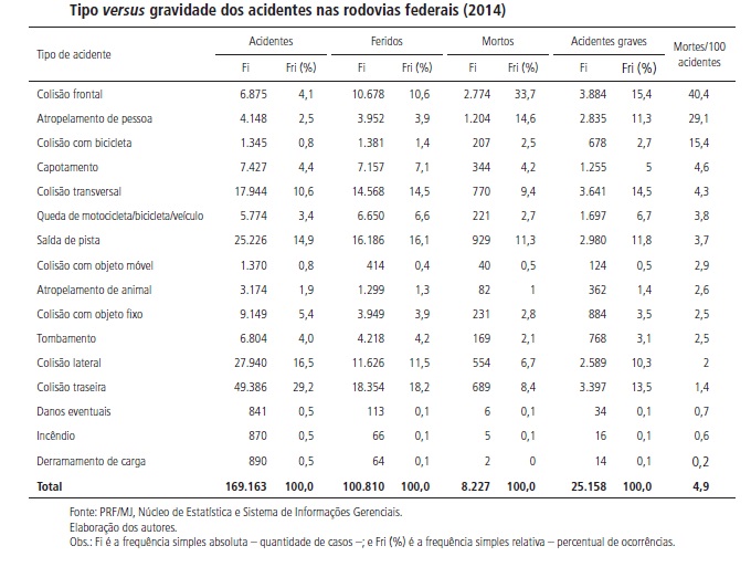 Enfim, os acidentes de trânsito no Brasil matam cerca de 45 mil pessoas por ano (Datasus) e deixam mais de 160 mil pessoas com lesões graves numa estimativa conservadora. Grande parte dessas mortes ocorre nas rodovias brasileiras, em especial nas rodovias federais, que no ano de 2014 tiveram cerca de 170 mil acidentes com mais de 8 mil mortes e 26 mil ferimentos graves.