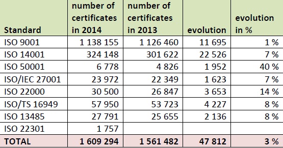 Com 1% e 7%, respectivamente, as normas ISO 9001 (gestão da qualidade) e ISO 14001 (gestão ambiental) atingiram gradualmente a estabilidade, embora, deve-se frisar que as suas novas edições revisadas em 2015 serão lançadas, que deverá alterar o quadro para o próximo ano.