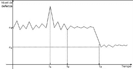 Nesta figura, o processo operava a um nível usual de defeitos n1. No instante t1 ocorreu uma não-conformidade (ou falha) esporádica que foi detectada online, provavelmente por um gráfico de controle de processo, voltando-se ao nível usual. No instante t2, dentro da linha de busca por melhorias contínuas, obteve-se uma redução da variação do processo mantendo o nível usual de defeitos. No instante t3, provavelmente após a realização de uma análise mais profunda offline, conseguiu-se trazer o processo a um patamar n2, correspondente a um consideravelmente melhor nível de qualidade.
